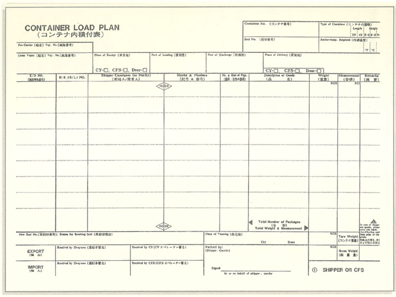 冷凍コンテナを使用する場合は、コンテナ明細書(Container Load Plan)の上部にある箇所に、指定の