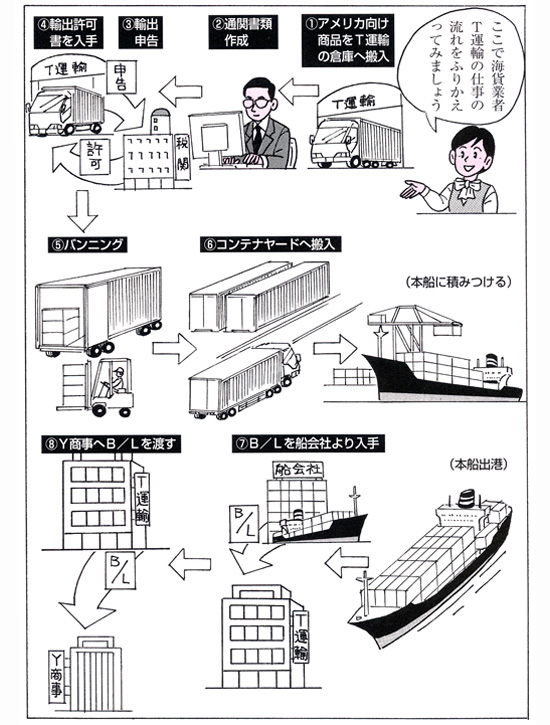 輸出の仕事の流れを理解しましょう。まずはイラストをもとに、どのような仕事が行われているのかを